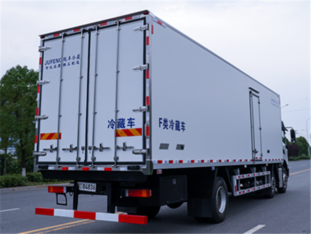 東風天錦8米6冷藏車廂體配置為:斷橋隔溫工藝,整體結構框架,內外面料為3mm新款啞光玻璃鋼夾保溫層真空復合而成,廂體厚度為8cm,最新款鋁合金包邊型材,型材局部厚度為4mm(鋼制鉚釘加固),廂體內部采用2個LED照明燈及廂體示寬燈,后門框不銹鋼材質,門框密封條為三元乙丙橡膠材質,加厚型不銹鋼合頁及鎖件;副梁為Q700車用大梁鋼,15mm厚大梁墊皮,加裝防撞膠塊,不銹鋼門鎖件,配后雙開門,副駕駛一側居中靠前開單側門一個,帶2個排水孔。