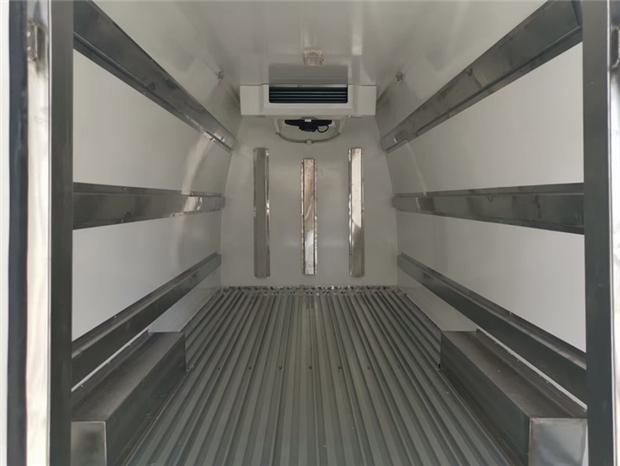 福田G9冷藏車車廂配置:廂體采用內外優質玻璃鋼板,內膽圓弧式廂體,地板為鋁花紋板,底板和四周廂板加裝通風槽,不銹鋼門框,鎖件。